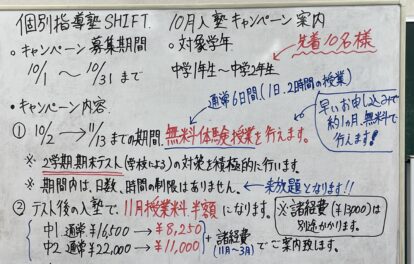 10月入塾キャンペーンのご案内です‼️ 毎年10月は、入塾キャンペーンを行なっておりますが、本年も行います😊 中学1年生、2年生が対象となります。中1、2年生、ともに先着10名までと致します‼️募集期間は、10月1日から … 続きを読む 10月入塾キャンペーンと2学期期末テスト対策についてのご案内。