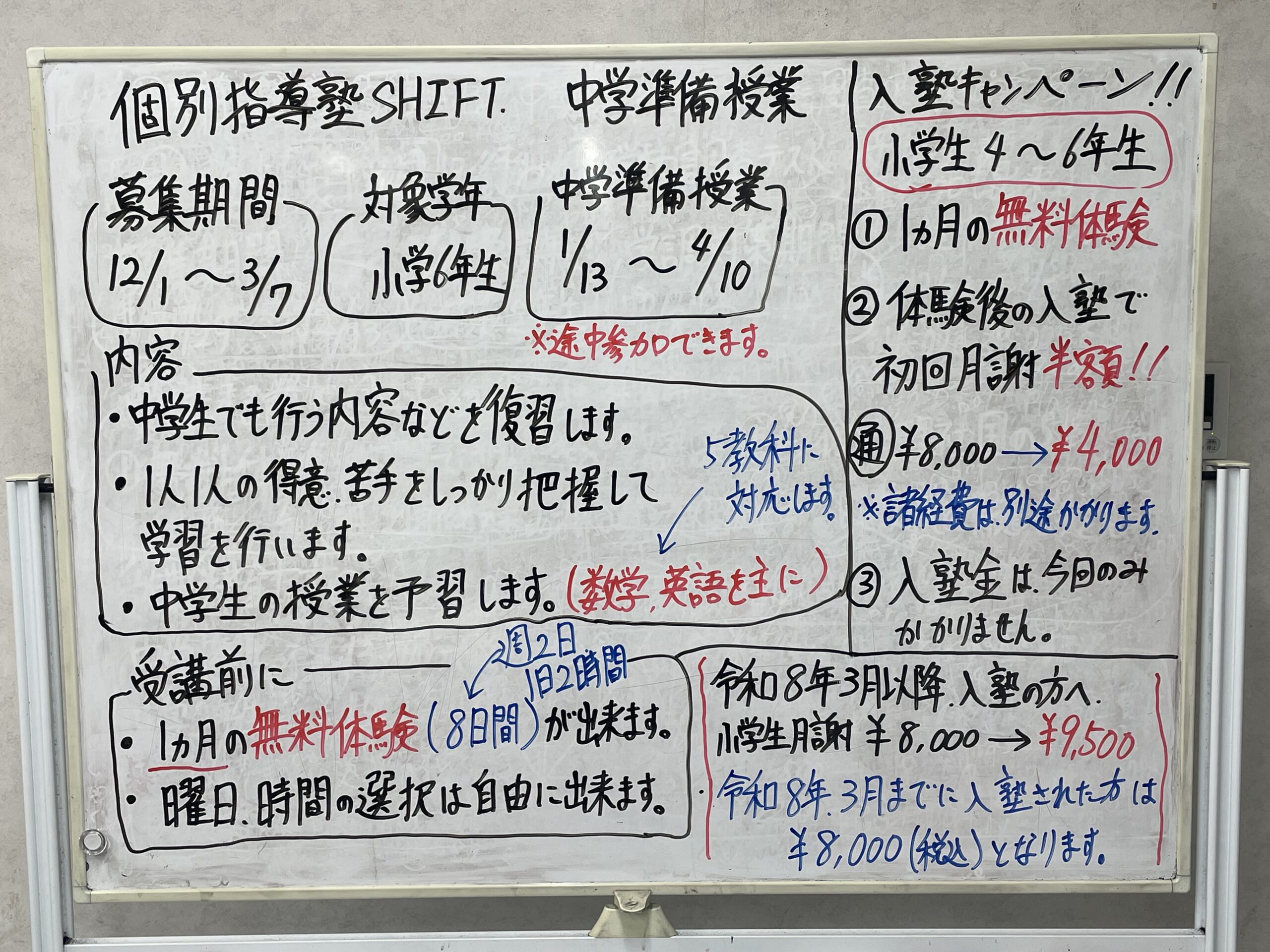 中学準備授業は、12月1日から3月7日を目処に募集しております😊中学準備授業は、令和8年1月13日から4月10日を目処に行っていきます!