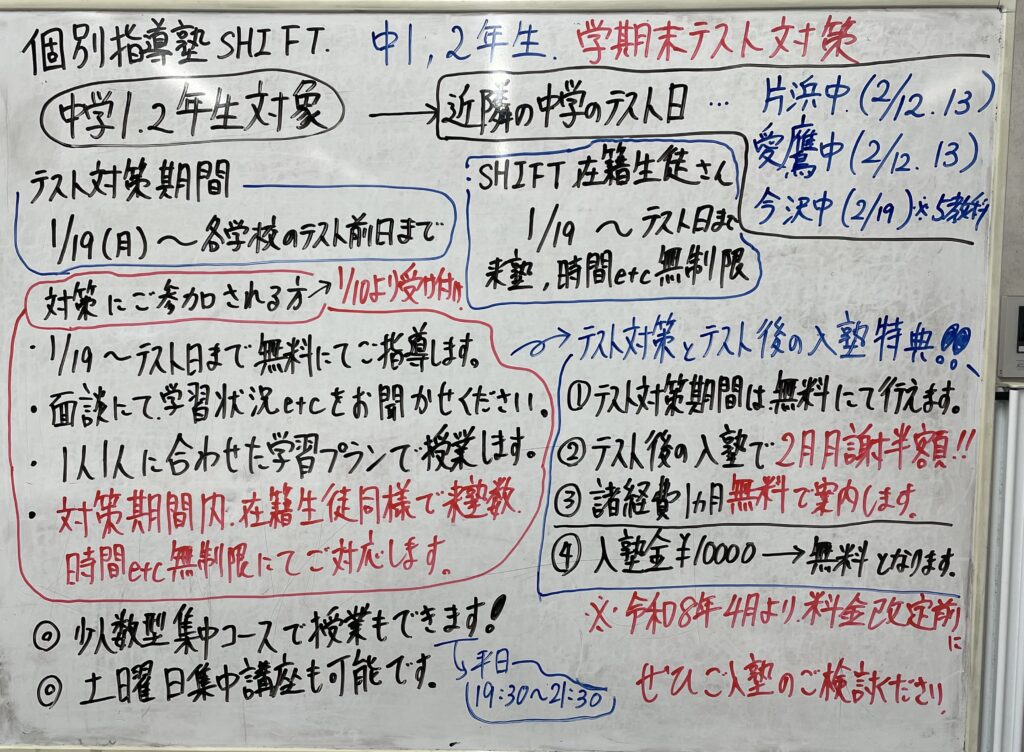 shiftに通われている生徒さん同様に1月19日からテストまでの期間、来塾数、授業時間の制限がありませんのでたくさんお越しいただくると幸いです😊また、前回の動画(投稿した内容)にあります、少人数型集中授業での体験会も同時に行えますので、お気になりましたらこちらでも対策も可能です‼️