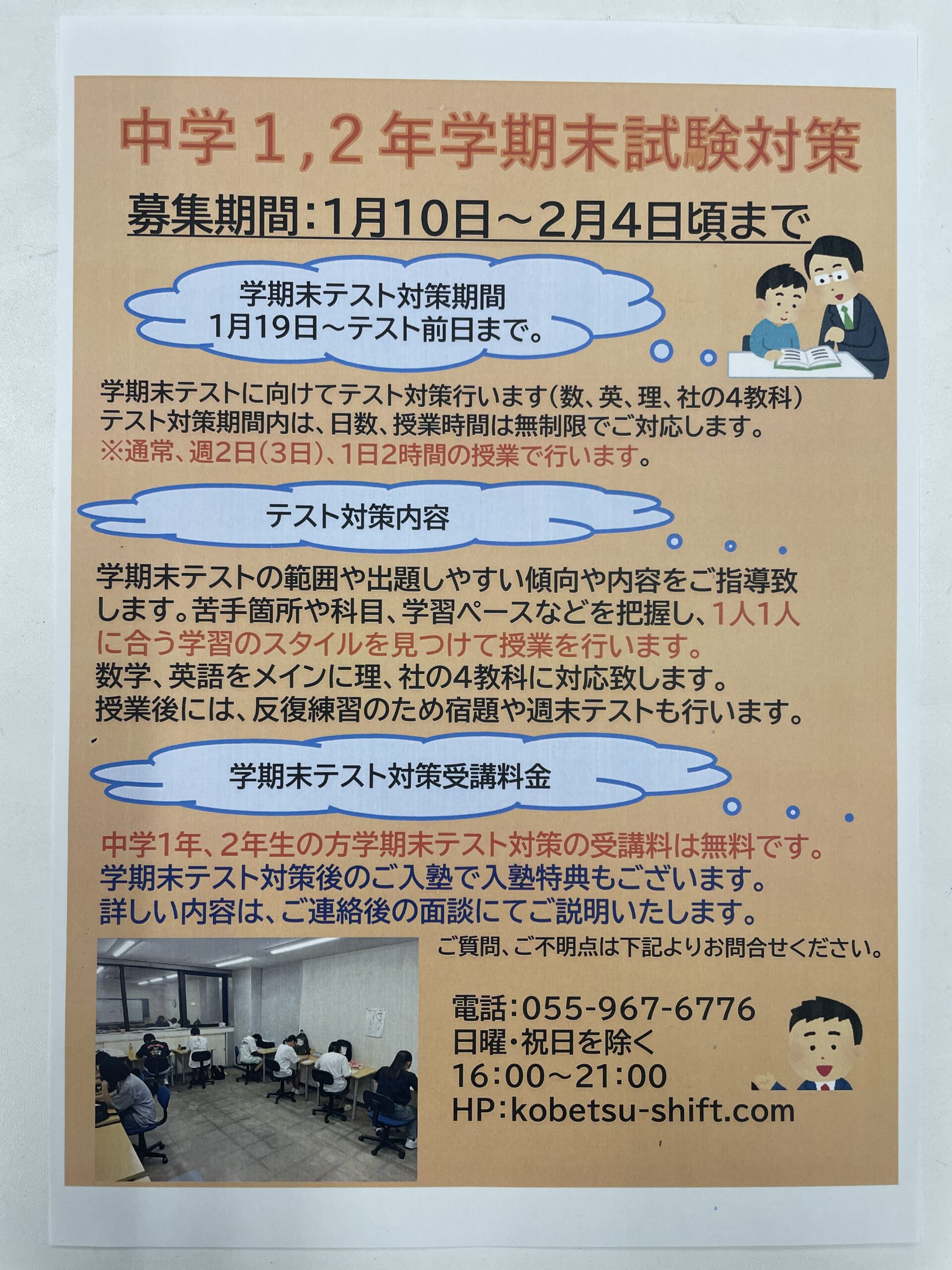 学期末テスト対策は、1月19日(月)から各学校のテスト日までが対策期間となります。