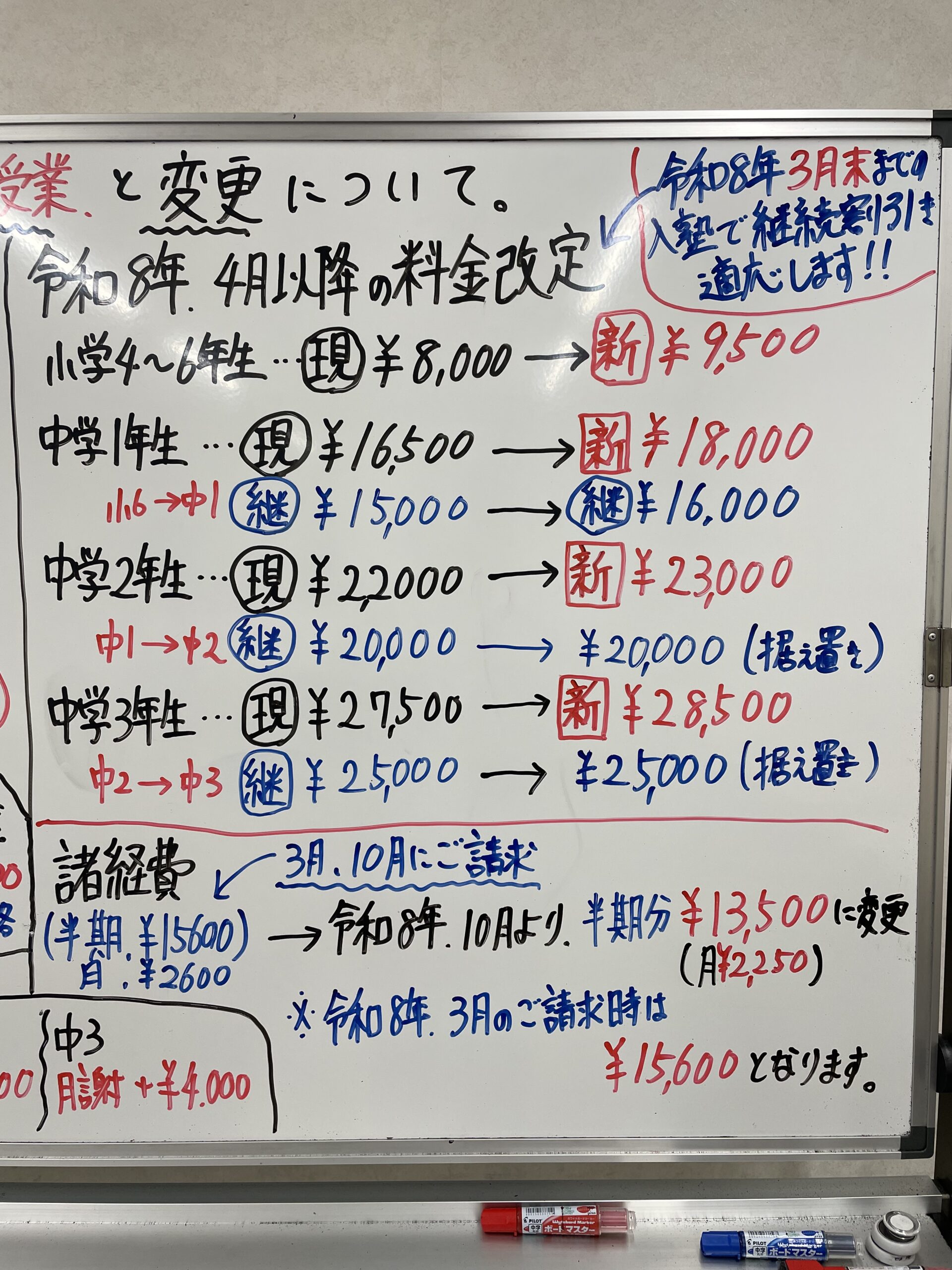 現在通われている生徒さん(中学1年生の方)と令和8年3月までに入塾されている生徒さんは、4月以降月謝は継続割引に対応するため20,000円が月謝となります。
