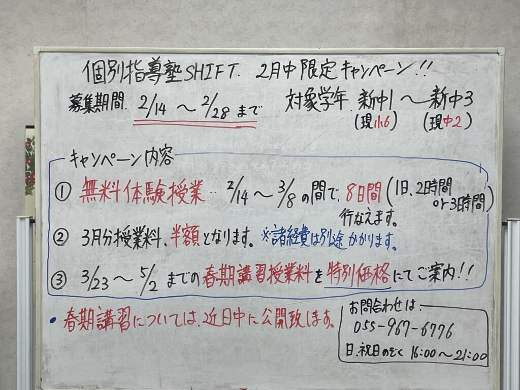 個別指導塾shift #沼津市個別指導塾 #2月入塾キャンペーン#無料体験授業 #期間限定