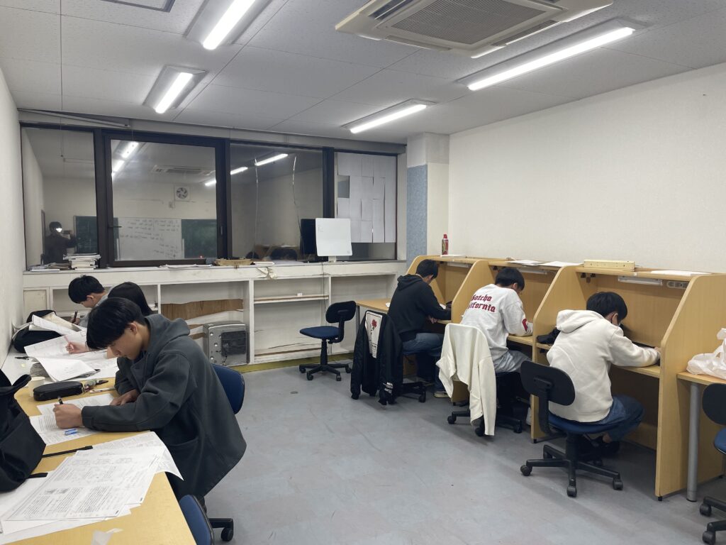 集団塾の授業形態と似ているように見えますが、個別指導塾ですので、1人1人授業を行います。また、日程によっては19時半から21時半まで、講師とマンツーマンのときもあります😊